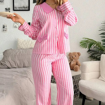 Stripe Buttoned Front Long Sleeve Top And Pants 2 Piece Sleepwear